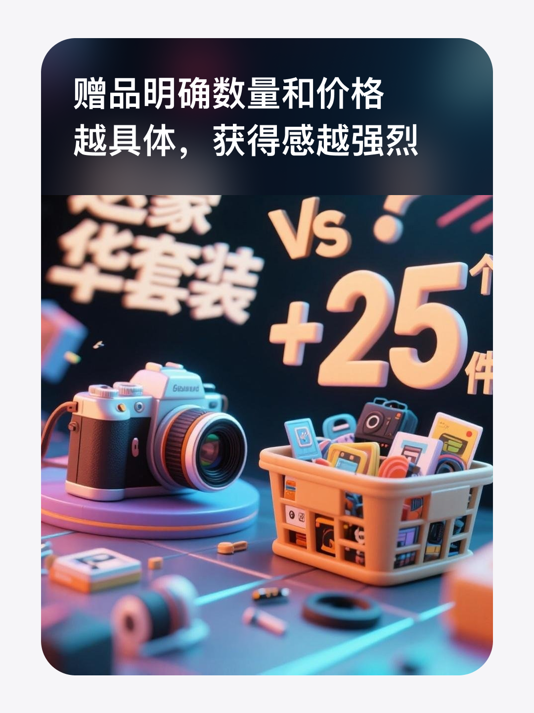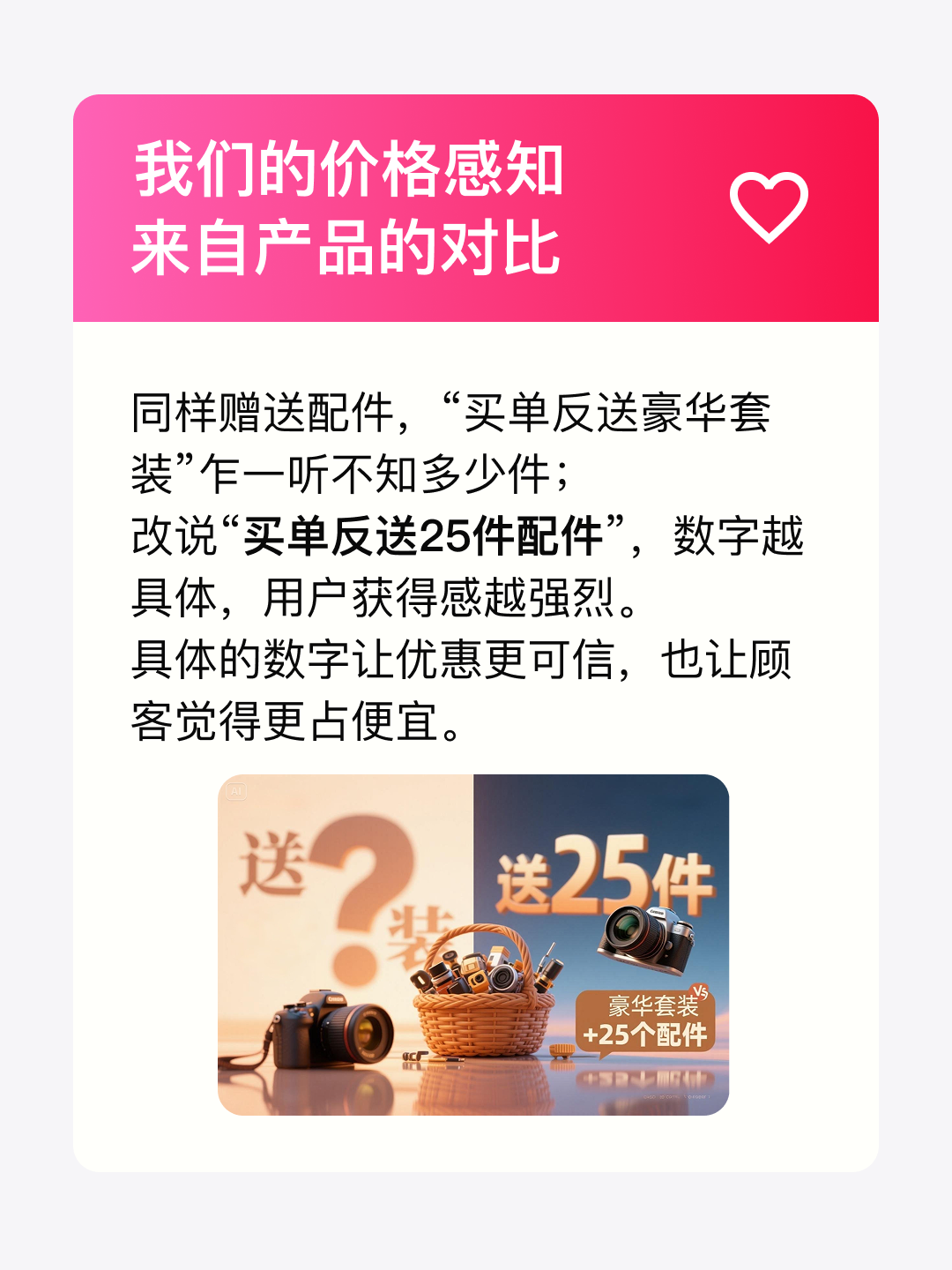 送贈品也一樣。說“買單反送豪華套裝”,大家不確定值多少錢。換個說法,“買一送二十五”,明確告訴用戶送多少件,獲得感立馬提高。數(shù)字越具體,感覺越實在。