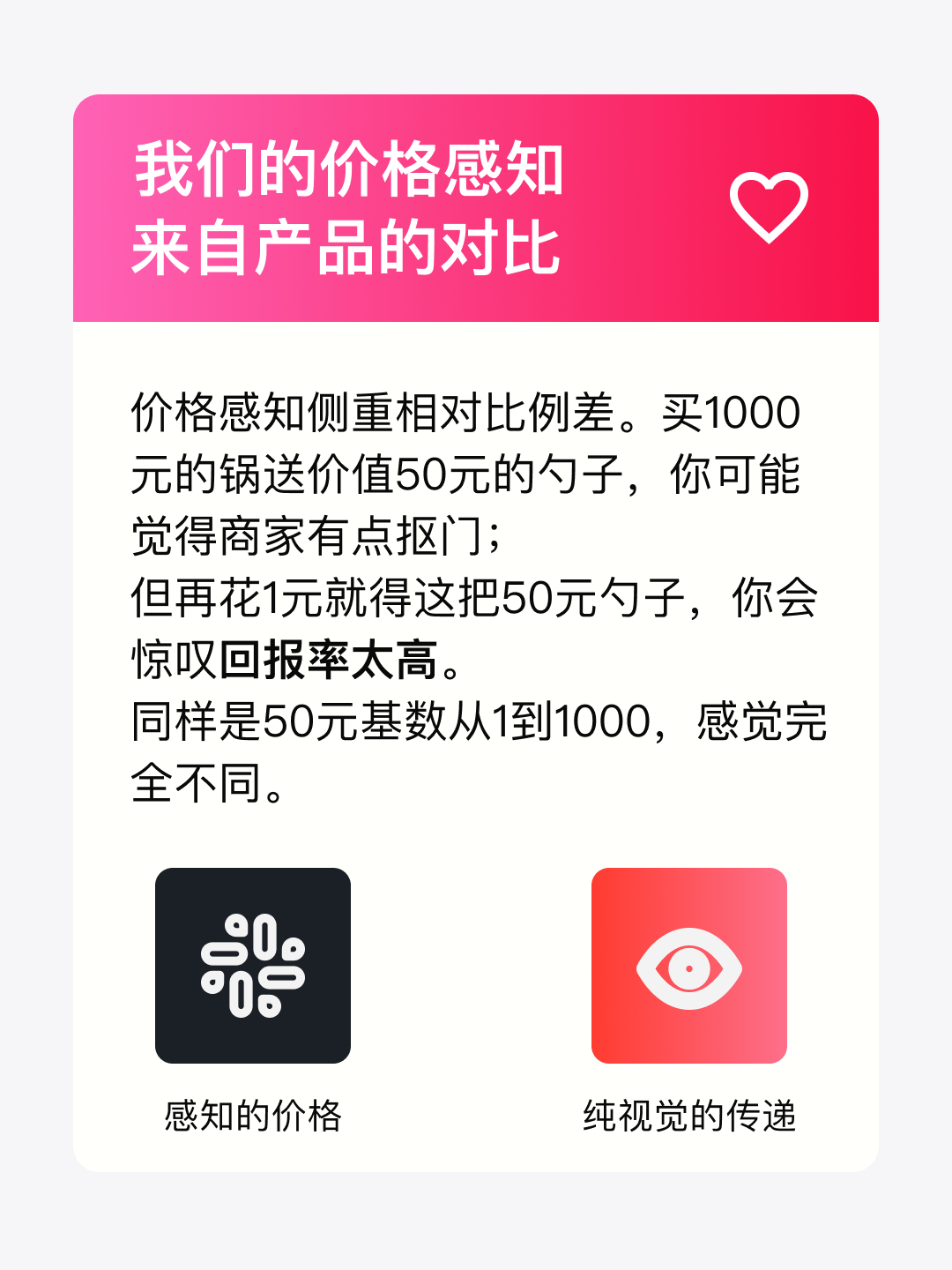 比如你賣一口鍋1000塊,送一個50塊錢的勺子,顧客會覺得小氣??赡銚Q一種方式:再花1塊錢送這個勺子,顧客立馬覺得劃算。明明都是同一個勺子,差別只在描述方式不同。