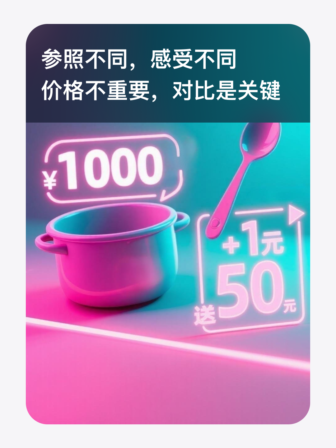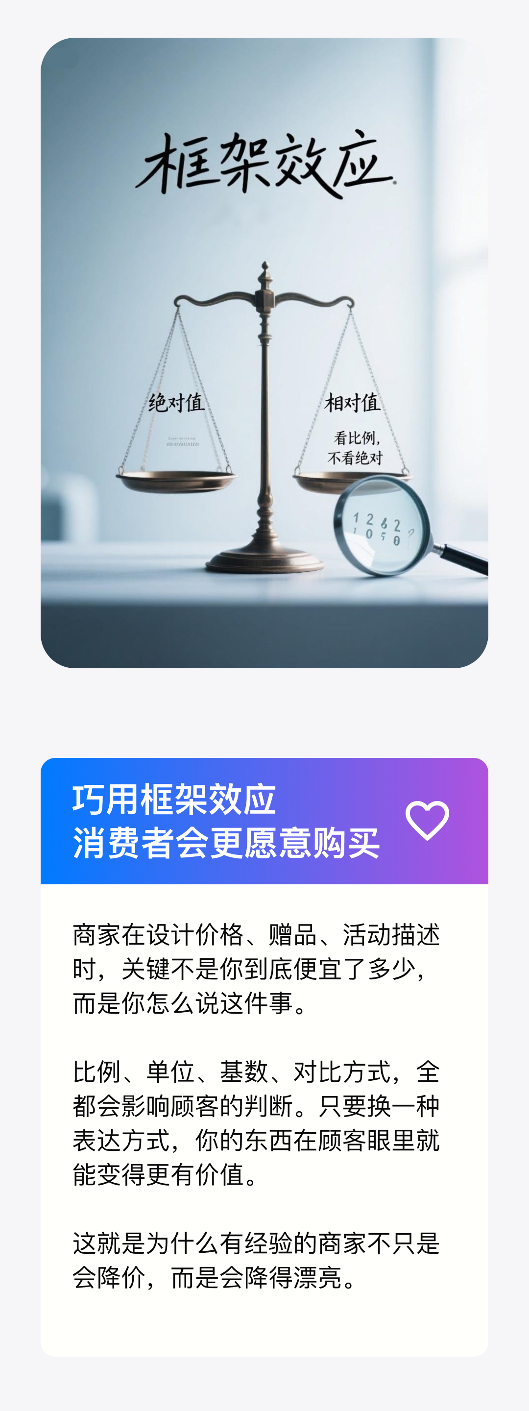 商家在設計價格、贈品、活動描述時,關(guān)鍵不是你到底便宜了多少,而是你怎么說這件事。比例、單位、基數(shù)、對比方式,全都會影響顧客的判斷。只要換一種表達方式,你的東西在顧客眼里就能變得更有價值。