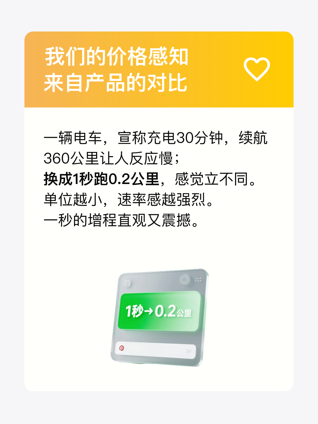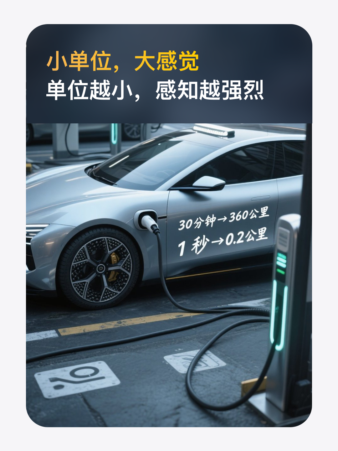 再比如充電續(xù)航。如果你說“30分鐘能充360公里”,用戶不一定反應得過來。但你換個說法,“1秒充進2公里”,立刻覺得性能驚人。單位換小了,速度感就被放大了。