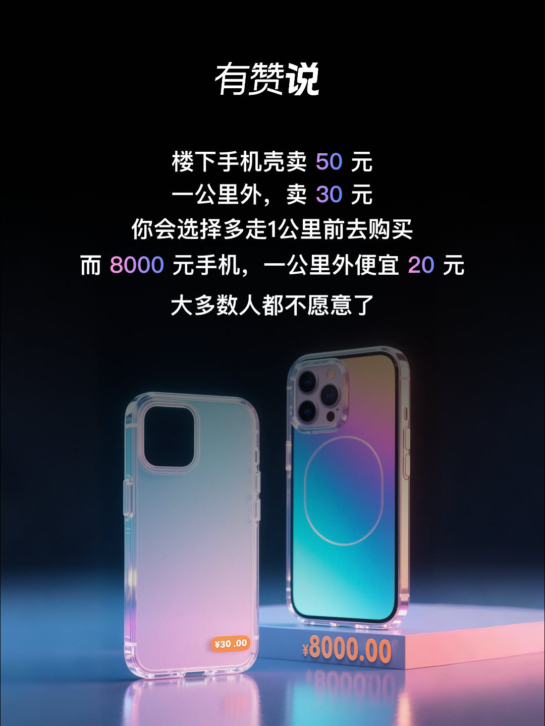 你有沒有發(fā)現(xiàn),同樣是省20塊錢,顧客的反應卻完全不同?比如一個手機殼,樓下賣50塊,一公里外賣30塊,顧客多半會多走一公里。可如果換成8000塊的手機,遠一點的店只便宜20塊,很多人卻懶得挪步。這不是顧客不在乎錢,而是因為他們在意的是比例,不是金額本身。