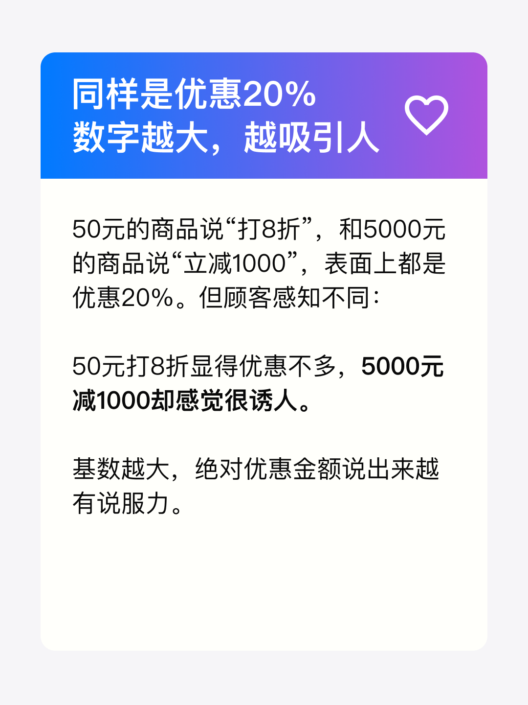價格打折也一樣。50塊的商品直接說“打八折”,不會有太強感受。但5000塊的商品如果說“立減1000”,同樣是八折,顧客的反應完全不同。大金額面前,要讓用戶看到具體省了多少,而不是打了幾折。