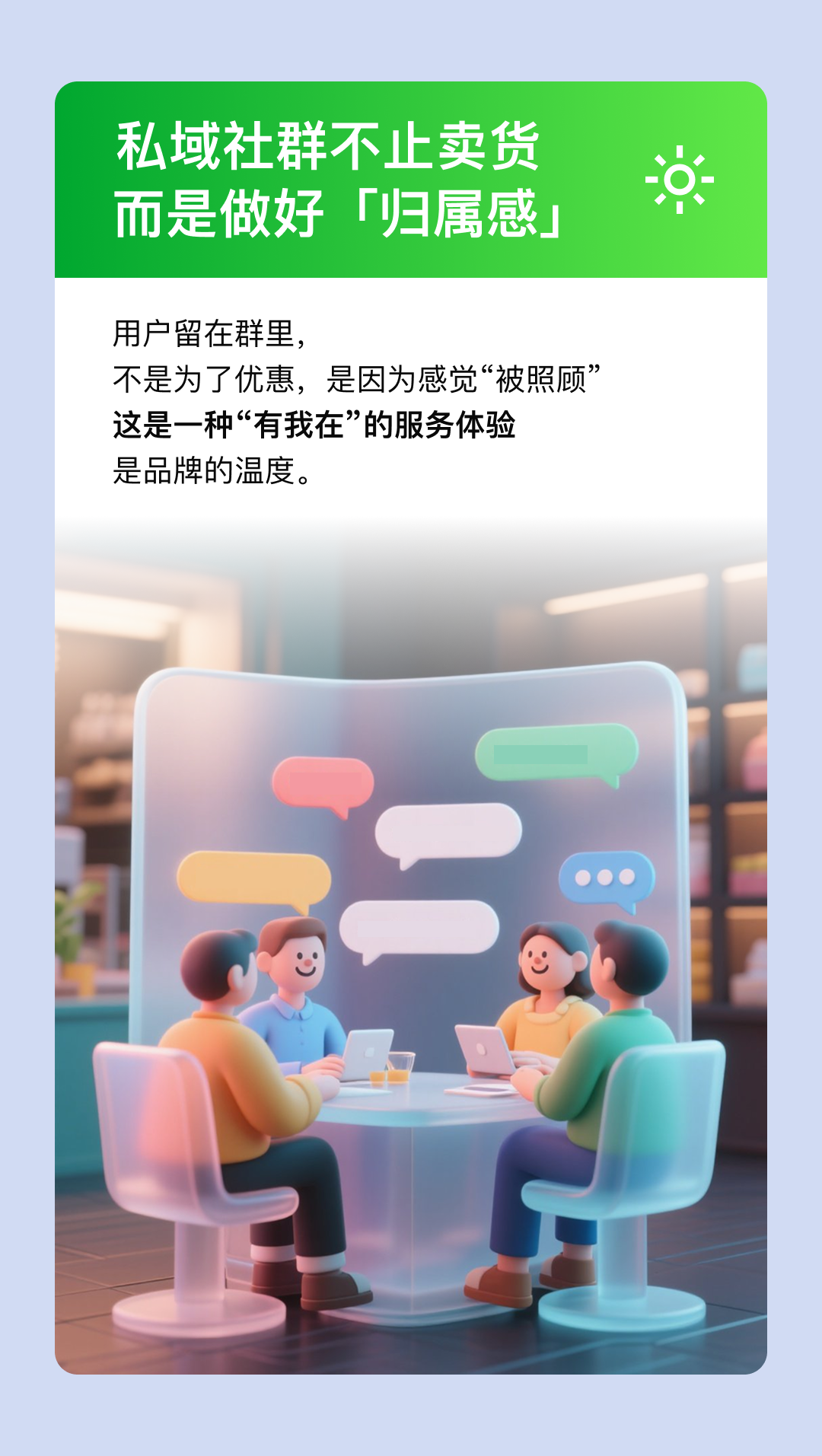 從“折扣池”到“情感池”。傳統(tǒng)思維里,很多商家把私域簡(jiǎn)單當(dāng)作發(fā)折扣、發(fā)優(yōu)惠券的渠道,殊不知價(jià)值在于連接和服務(wù)。一項(xiàng)消費(fèi)者心理研究指出,只有當(dāng)用戶在私域空間中感受到被重視、被理解、被認(rèn)同,感覺(jué)得自己屬于這個(gè)群體時(shí),歸屬感才會(huì)自然產(chǎn)生。歸屬感一旦建立,用戶對(duì)這個(gè)群體就會(huì)產(chǎn)生強(qiáng)烈依賴和忠誠(chéng)度,主動(dòng)留在群里互動(dòng),甚至自發(fā)為品牌宣傳。換言之,私域運(yùn)營(yíng)的本質(zhì)是“情感經(jīng)營(yíng)”:通過(guò)社群持續(xù)提供有價(jià)值的信息、專屬服務(wù)或互動(dòng)活動(dòng),滿足用戶的情感需求和成就感。比如很多社群運(yùn)營(yíng)專員強(qiáng)調(diào),發(fā)自內(nèi)心的關(guān)懷和長(zhǎng)期維護(hù)才是促使老客戶分享和轉(zhuǎn)介紹的根本。
