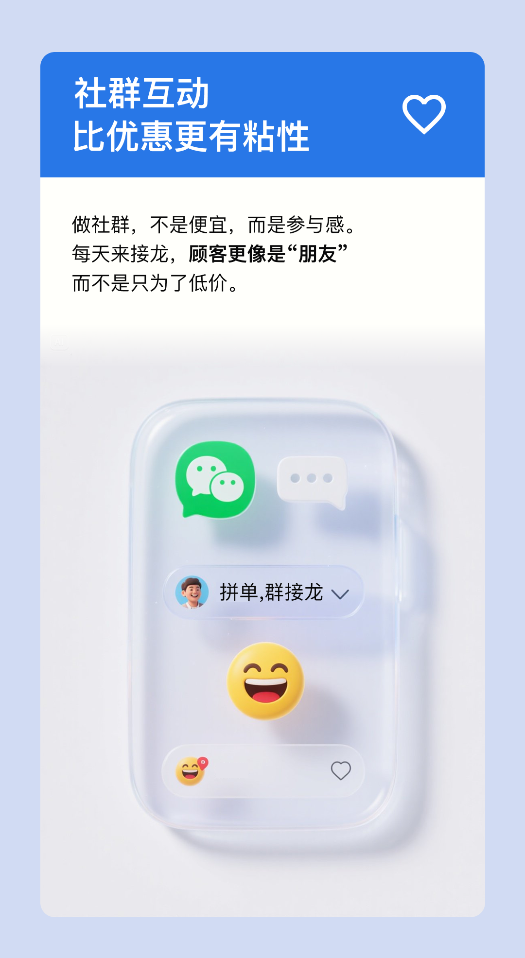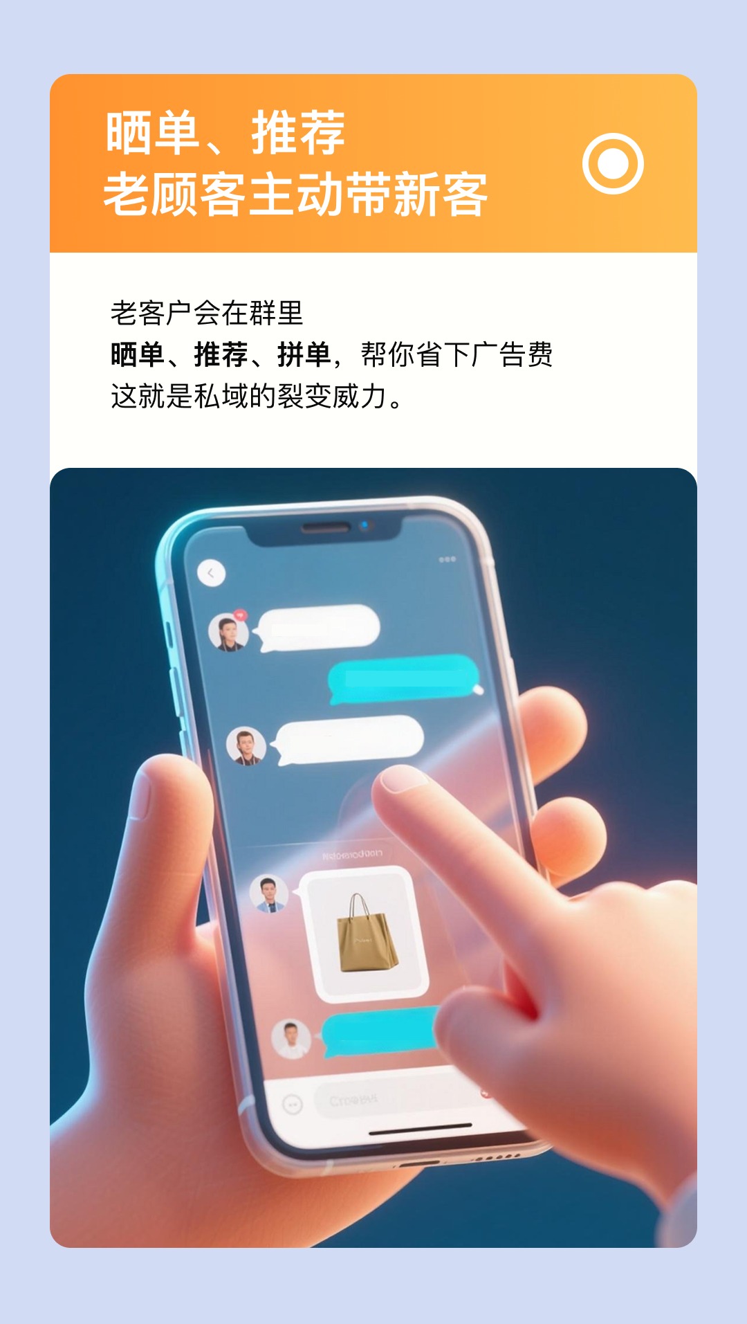 利用口碑裂變:鼓勵(lì)滿意老客在群內(nèi)分享購(gòu)買心得或拼單活動(dòng)。一旦有人下單并曬圖,其他群友也會(huì)蠢蠢欲動(dòng)。例如在小區(qū)超市微信群中,已有用戶經(jīng)常主動(dòng)拉入親友一起拼單,**幫店家轉(zhuǎn)介紹賣貨。商家也可設(shè)置轉(zhuǎn)介紹獎(jiǎng)勵(lì)、拼團(tuán)優(yōu)惠等,放大這種效應(yīng)——畢竟“顧客介紹的顧客”信任度**,轉(zhuǎn)化率往往也更高。