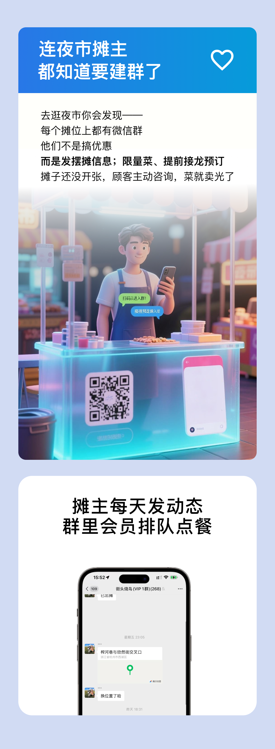 主動(dòng)引流入群:在線下門店、攤位設(shè)置掃碼引導(dǎo),店員一句“**加群吧”即可;向顧客承諾“群里有店里沒(méi)有的限量?jī)?yōu)惠、可直接下單送貨”,讓顧客感受加入群的價(jià)值,例如“我們?nèi)豪锩刻煊械昀镔u完的小蛋糕預(yù)定信息,還能在群里搶單”,聽(tīng)起來(lái)風(fēng)險(xiǎn)小又實(shí)惠,顧客通常會(huì)破防同意加入。