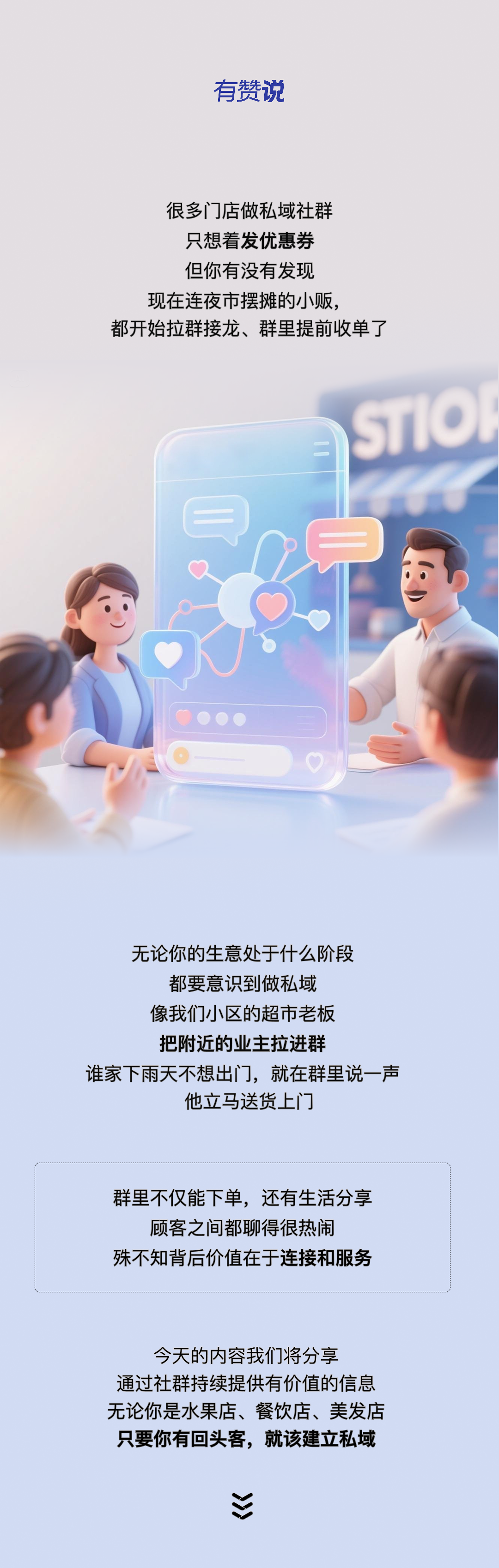 私域流量不是一時(shí)的“流量風(fēng)口”,而是零售和服務(wù)新常態(tài)。無(wú)論何時(shí)何地,商家都該培養(yǎng)這種意識(shí):把客戶沉淀到自己的群里,日常觸達(dá)、互動(dòng)、提供價(jià)值,而不只是零散發(fā)券。打破誤解:私域不是“割韭菜”而是賦能用戶。借助社群,我們既能讓顧客感覺(jué)“有需要就找我”,也能讓品牌保持貼心形象,從而打造持續(xù)的客戶粘性和口碑?dāng)U散。只有這樣,私域才能真正為門店帶來(lái)長(zhǎng)期增長(zhǎng)和轉(zhuǎn)化。