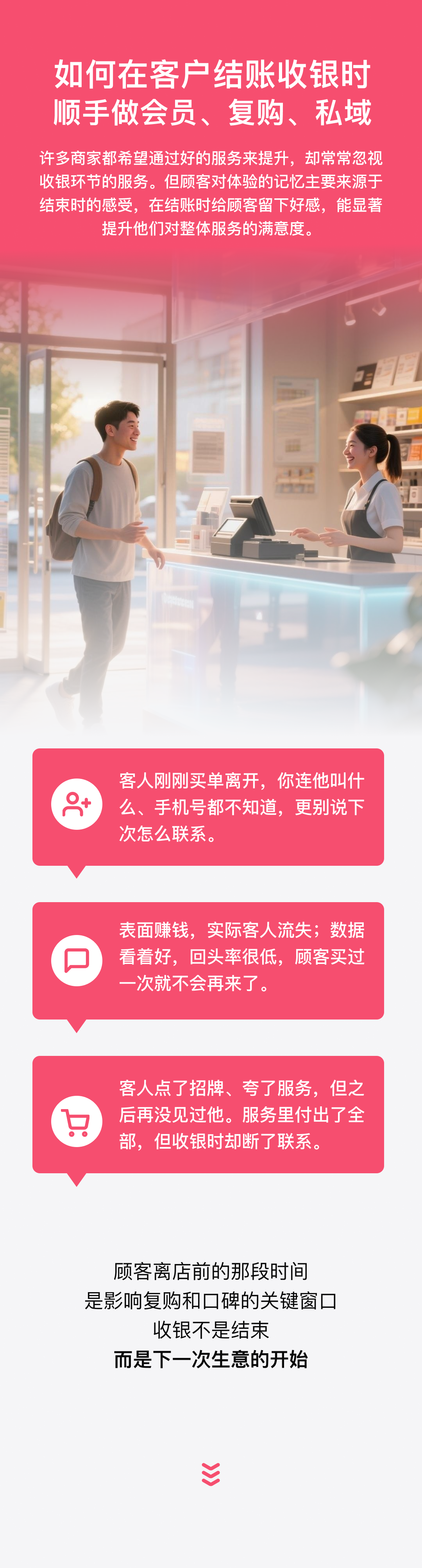 其實你根本不用從朋友圈發(fā)圈、私信轟炸開始,第一步就是:從顧客結(jié)賬那一刻開始,把他留下來。
