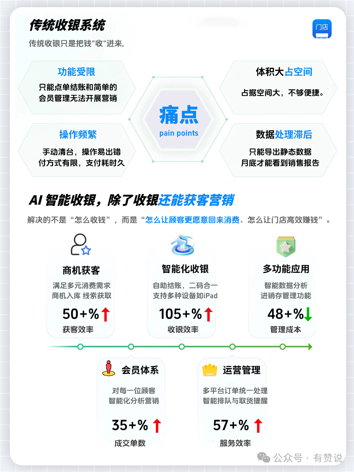 是因為:“AI智能收銀系統(tǒng)”解決的不**是“怎么收錢”,而是高效收銀的同時解決了“怎么讓顧客更愿意回來消費、怎么讓門店高效賺錢”。