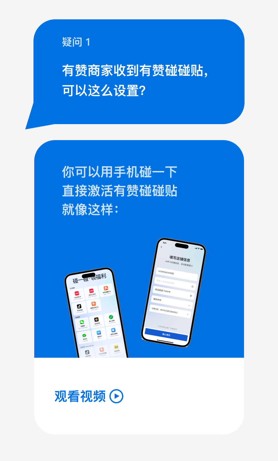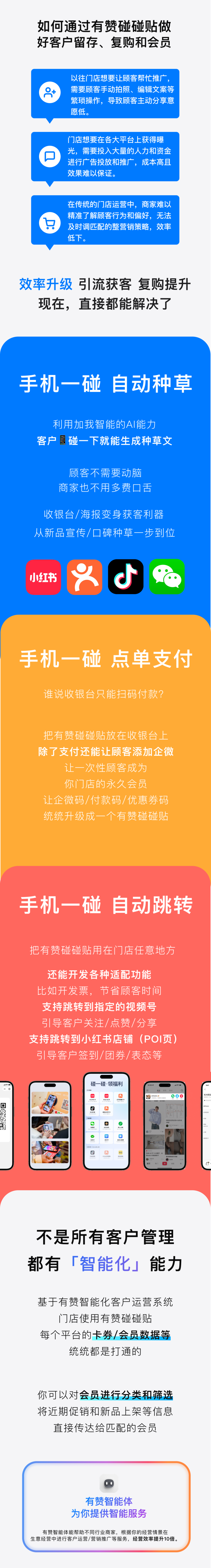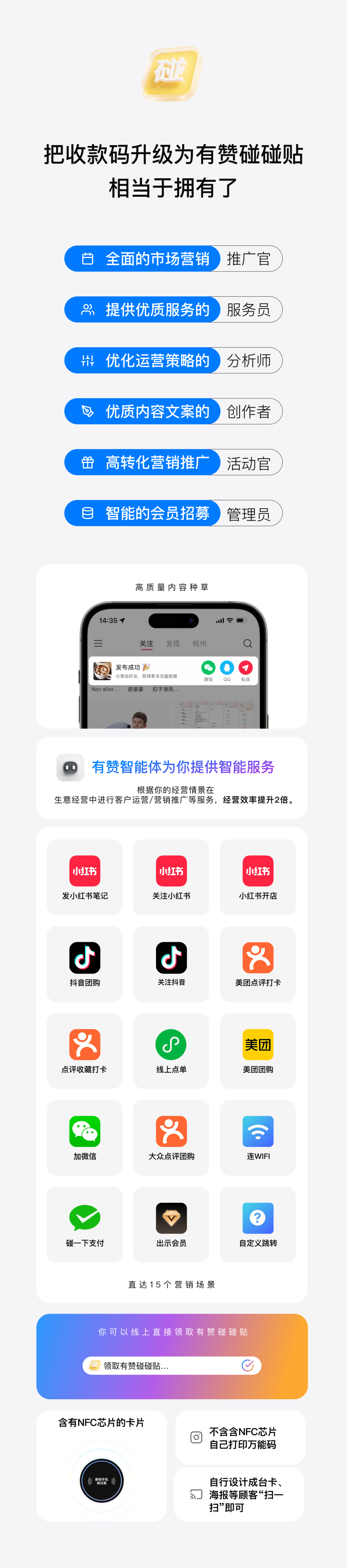 誰說收銀臺(tái)只能掃碼付款?把有贊碰碰貼放在收銀臺(tái)上,除了支付還能讓顧客添加企微,讓一次性顧客成為你門店的**會(huì)員,讓企微碼/付款碼/優(yōu)惠券碼,統(tǒng)統(tǒng)升級(jí)成一個(gè)有贊碰碰貼。