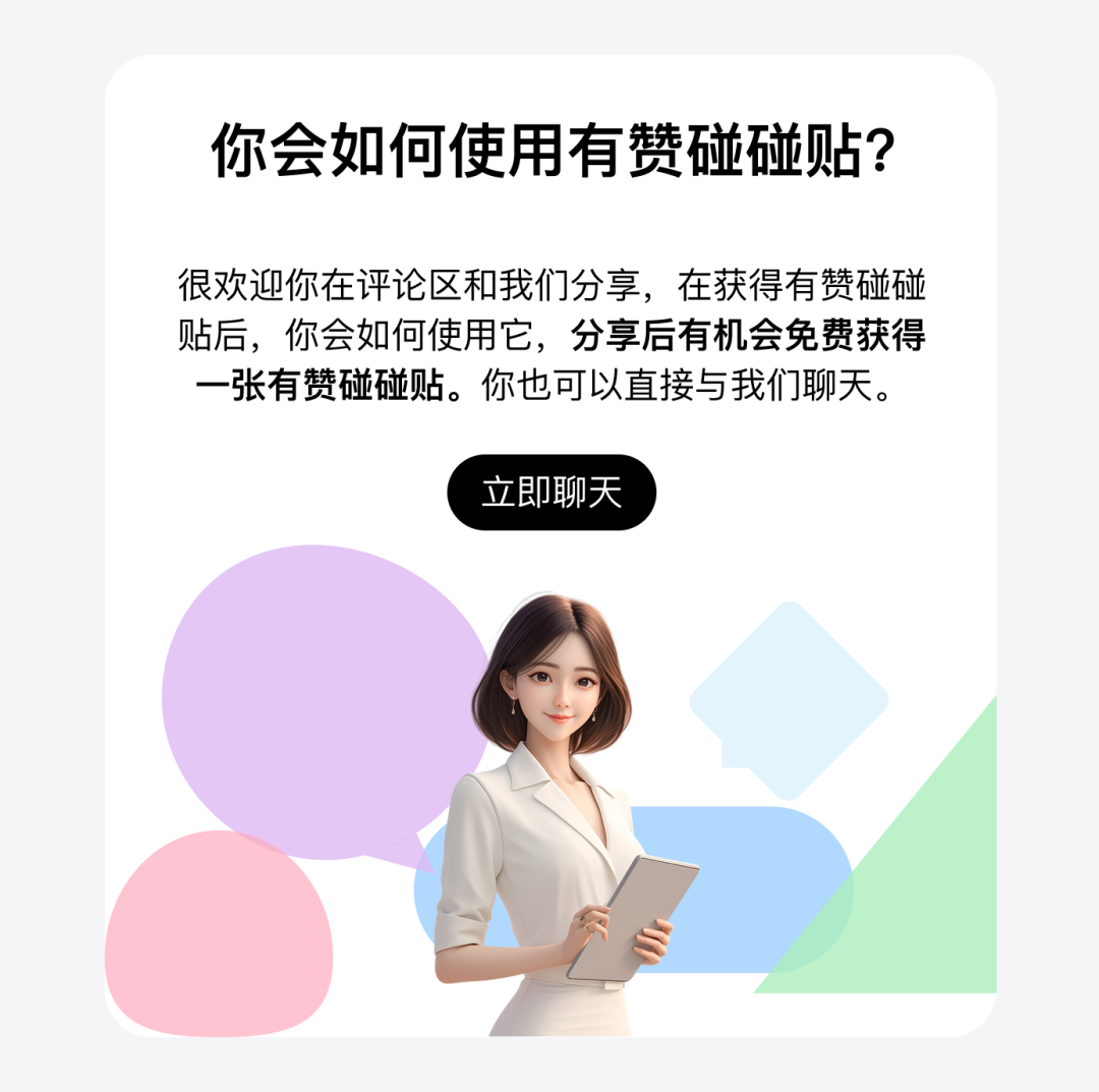歡迎你在評(píng)論區(qū)暢享,如何使用有贊碰碰貼,你將有機(jī)會(huì)**領(lǐng)取。當(dāng)然,你也可以點(diǎn)擊圖片,可直接領(lǐng)取有贊碰碰貼。