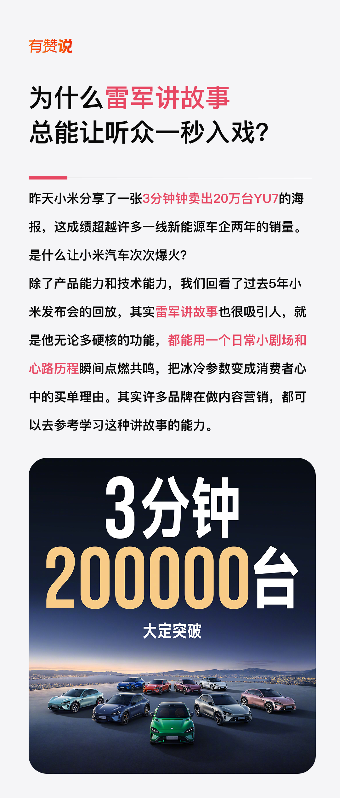 昨天,小米用一張海報(bào)刷屏:3分鐘賣出20萬臺(tái)YU7,銷量超過多家**新能源車企兩年總和。作為商家,我們想知道,是什么讓小米汽車每次都能**市場?