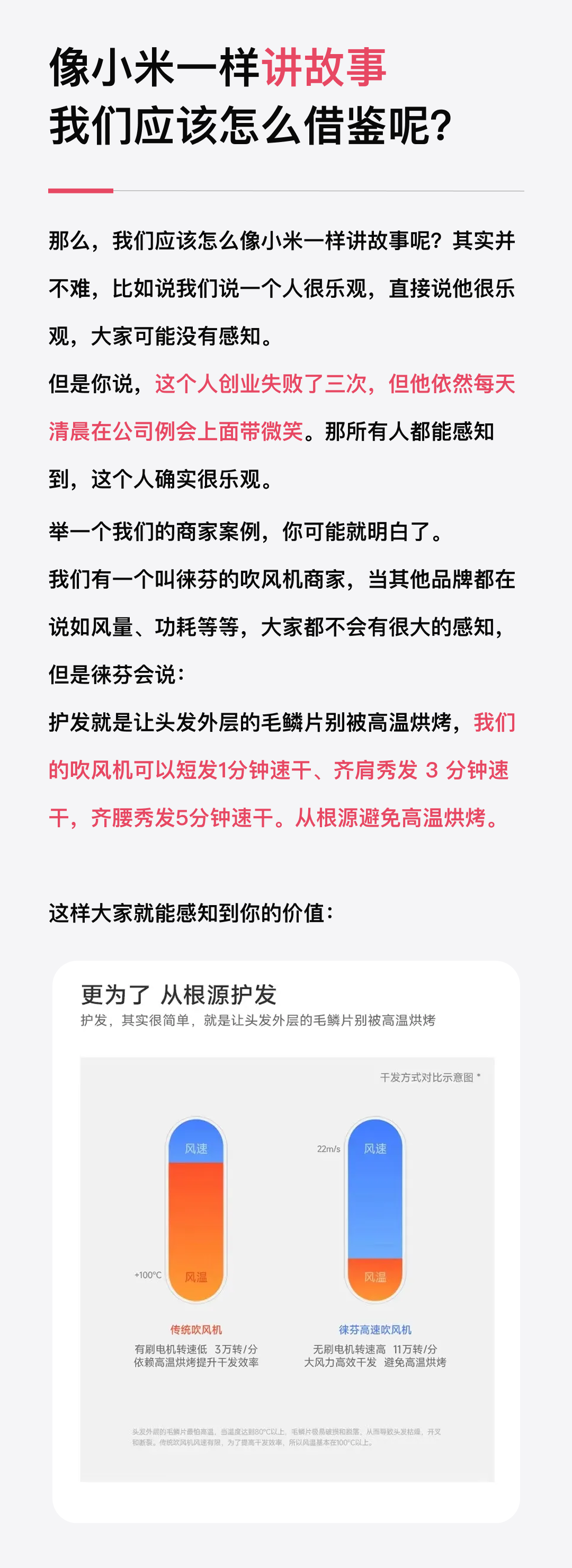一句話里就有場景、有效果,顧客立刻明白這臺(tái)吹風(fēng)機(jī)能解決什么痛點(diǎn)。
