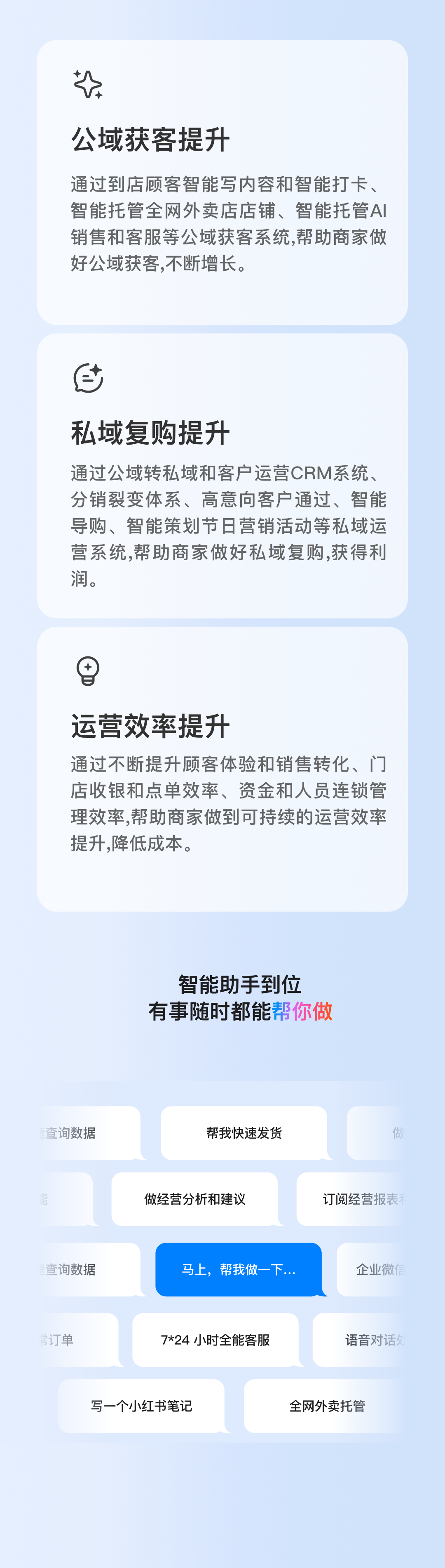 通過到店顧客智能寫內(nèi)容和智能打卡、智能托管全網(wǎng)外賣店店鋪、智能托管AI銷售和客服等公域獲客系統(tǒng),幫助商家做好公域獲客,不斷增長。
