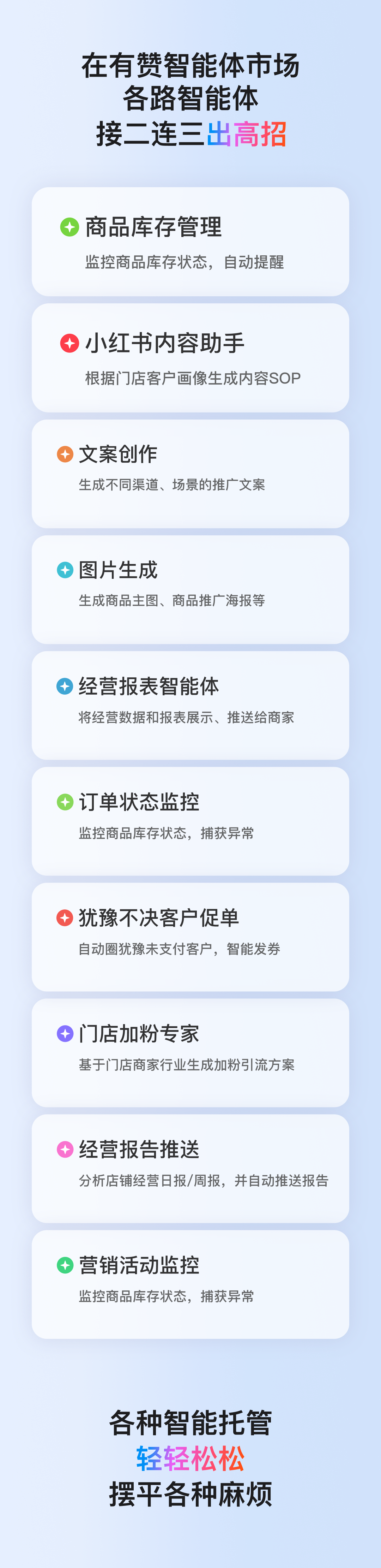 比如幫你快速發(fā)貨、做經(jīng)營分析和建議、寫一個小紅書筆記、全網(wǎng)外賣托管、7*24 小時全能客服、語音對話處理店務(wù)等等。