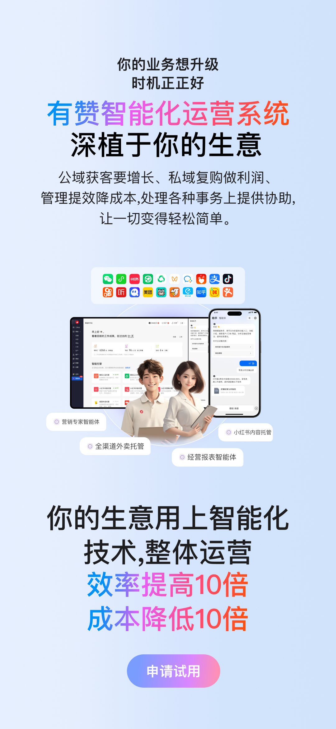 你的業(yè)務(wù)想升級,時機正正好。有贊智能化運營系統(tǒng),深植于你的生意。