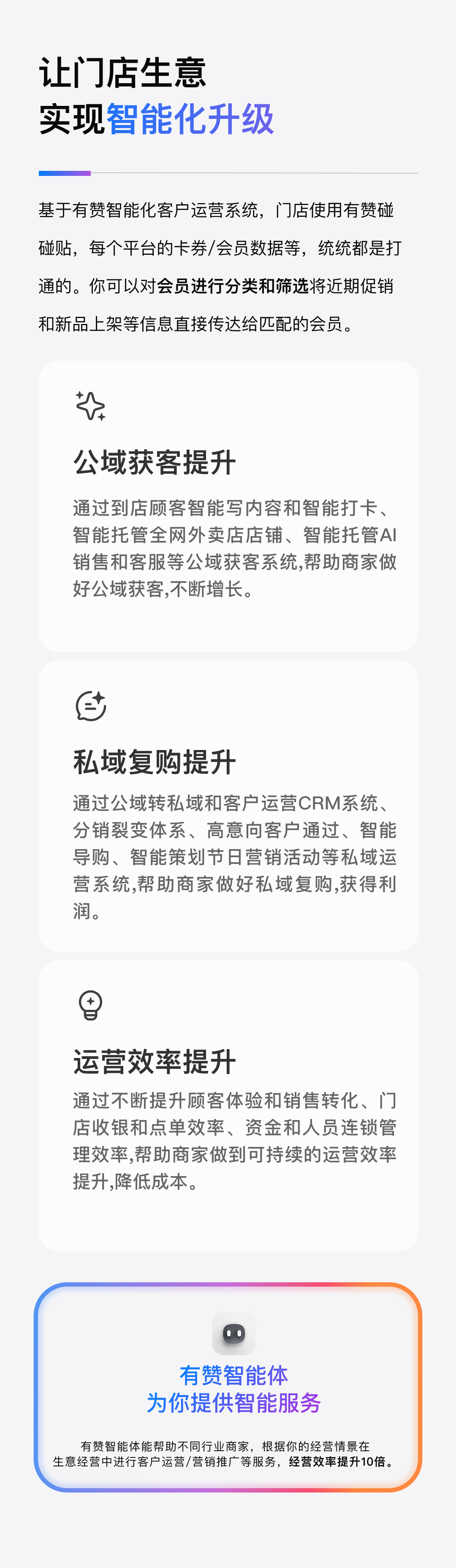 基于有贊智能化客戶運(yùn)營(yíng)系統(tǒng),門店使用有贊碰碰貼,每個(gè)平臺(tái)的卡券/會(huì)員數(shù)據(jù)等,統(tǒng)統(tǒng)都是打通的。你可以對(duì)會(huì)員進(jìn)行分類和篩選將近期促銷和新品上架等信息直接傳達(dá)給匹配的會(huì)員。