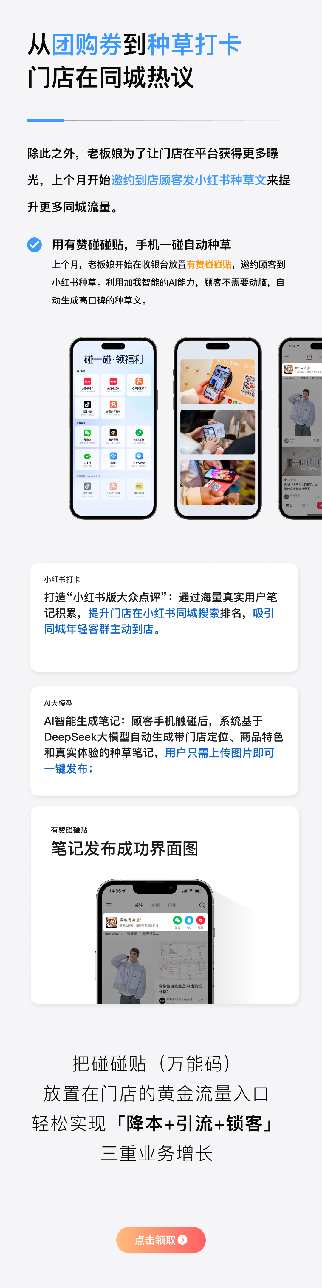 上個(gè)月,老板娘開始在收銀臺(tái)放置有贊碰碰貼,邀約顧客到小紅書種草。利用加我智能的AI能力,顧客不需要?jiǎng)幽X,自動(dòng)生成高口碑的種草文。